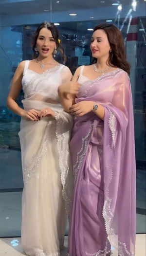 It comes paired with a matching blouse adorned with rich diamond work, completing the glamorous look. Lightweight, graceful, and designed to make you stand out effortlessly.
