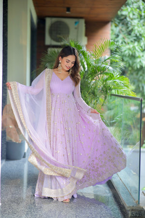 Premium readymade Anarkali suit set (3 pieces), designed with a royal blend of elegance and comfort. Intricately handcrafted with thread and sequin embroidery for a luxurious look.