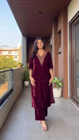 Velvet Collection for the winter season featuring an exclusive 3-piece suit set. Crafted from premium velvet fabric with elegant sequence embroidery work, this outfit includes a matching pant and dupatta for a luxurious, stylish look.