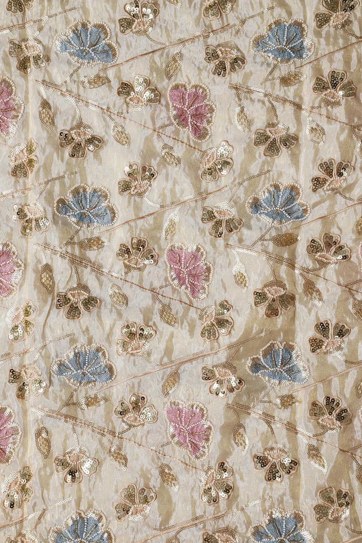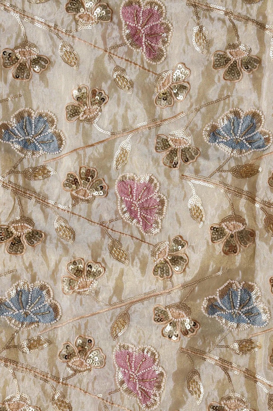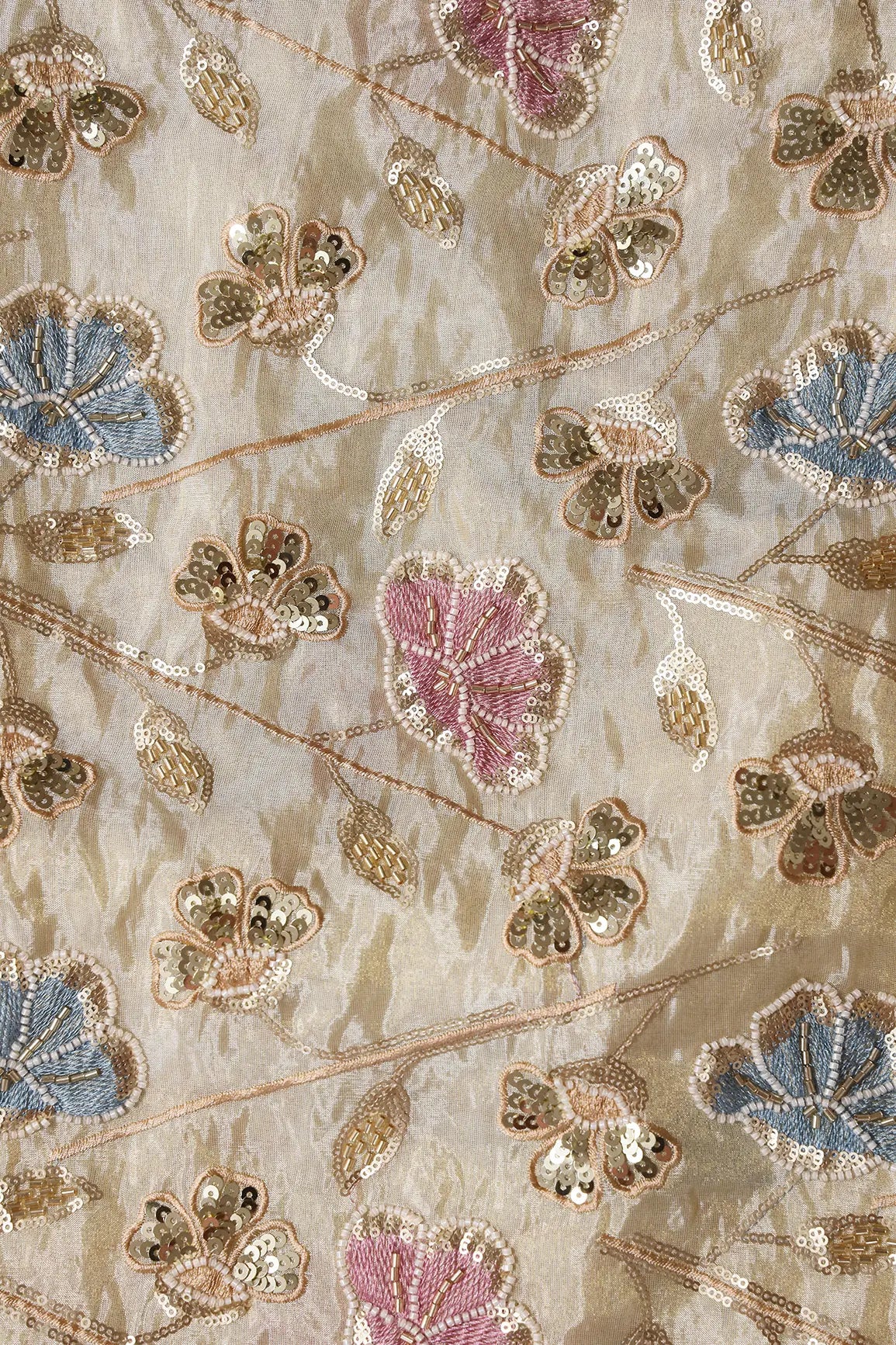 White Beads With Sequins Beautiful Floral Embroidery On Dyeable Viscose Zari Tissue Fabric