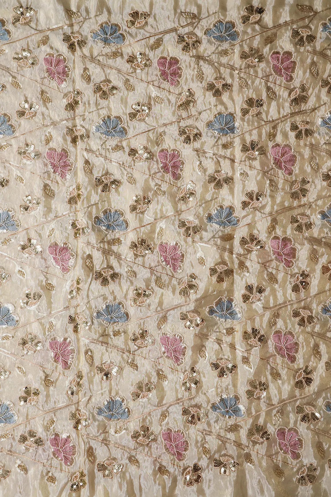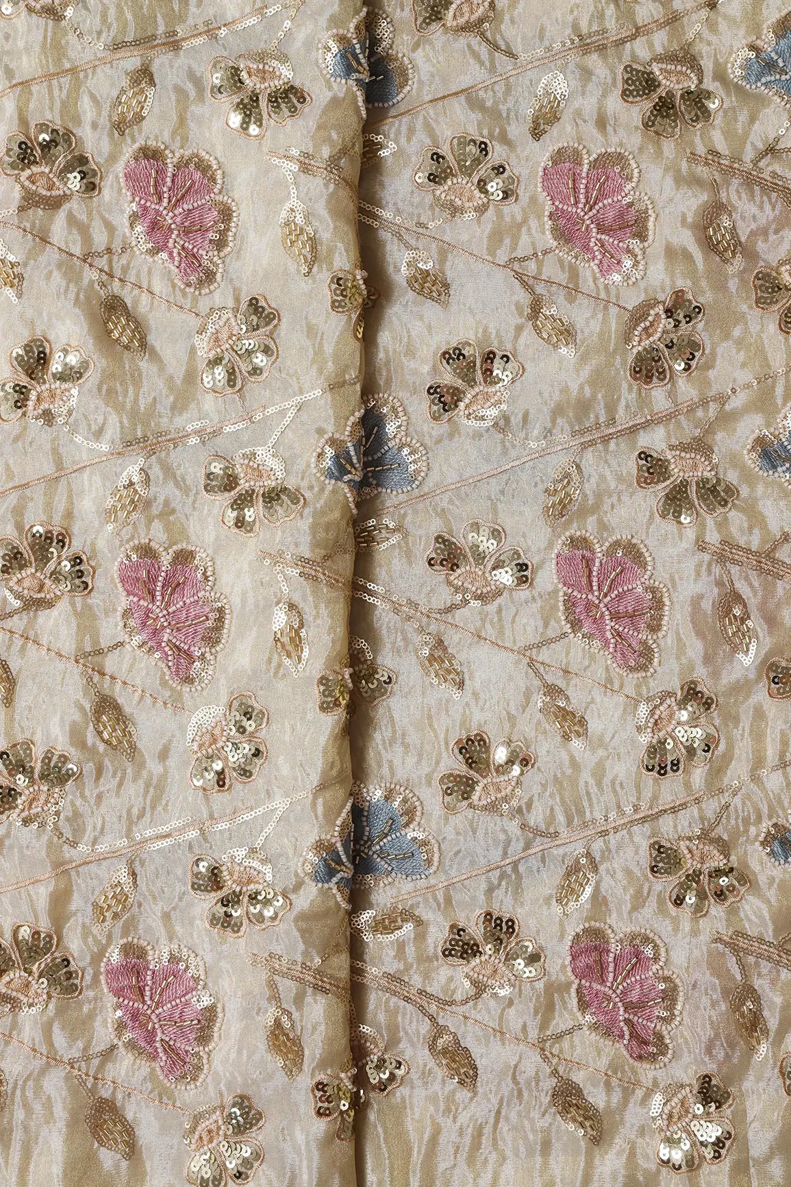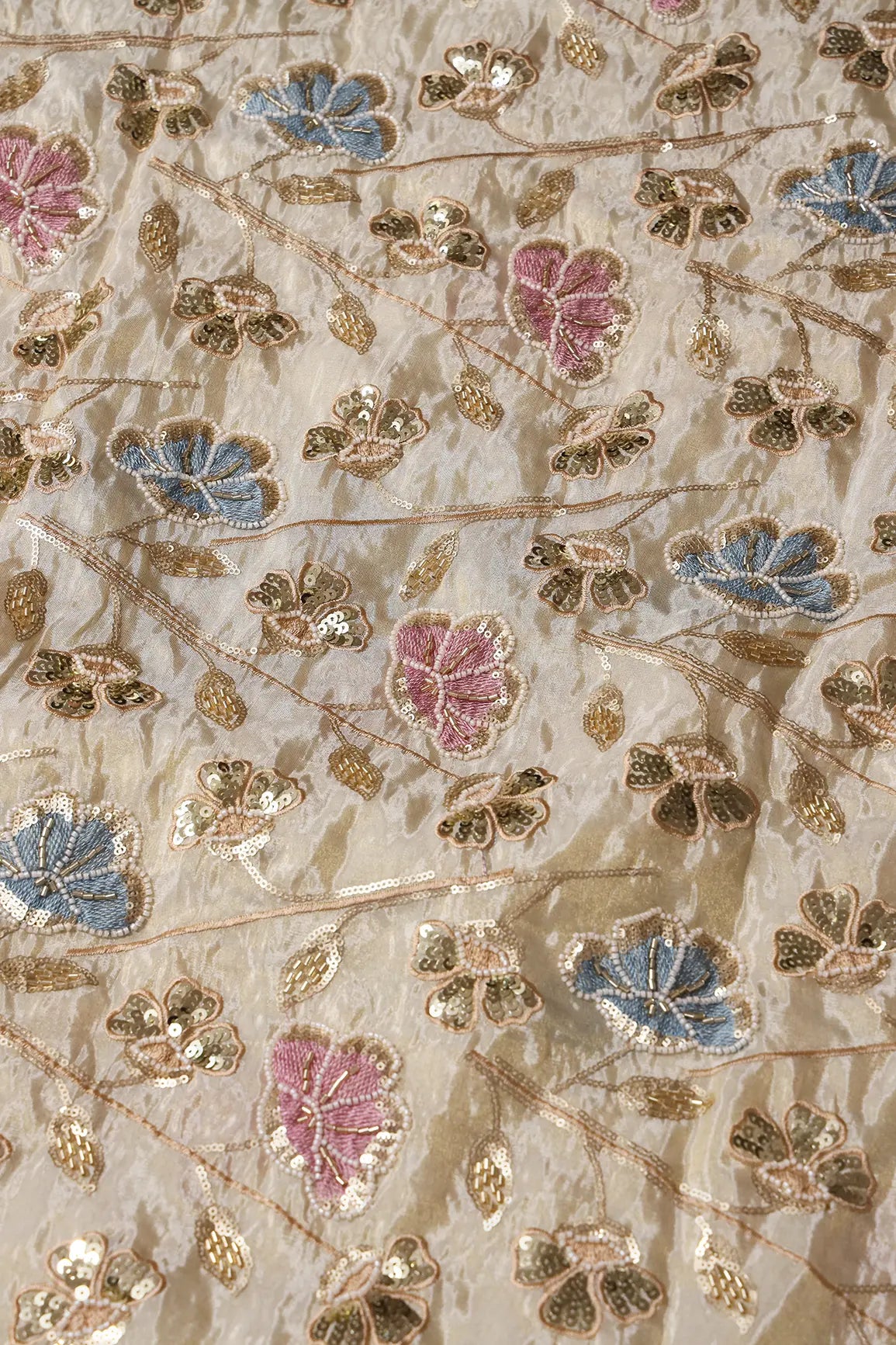 White Beads With Sequins Beautiful Floral Embroidery On Dyeable Viscose Zari Tissue Fabric