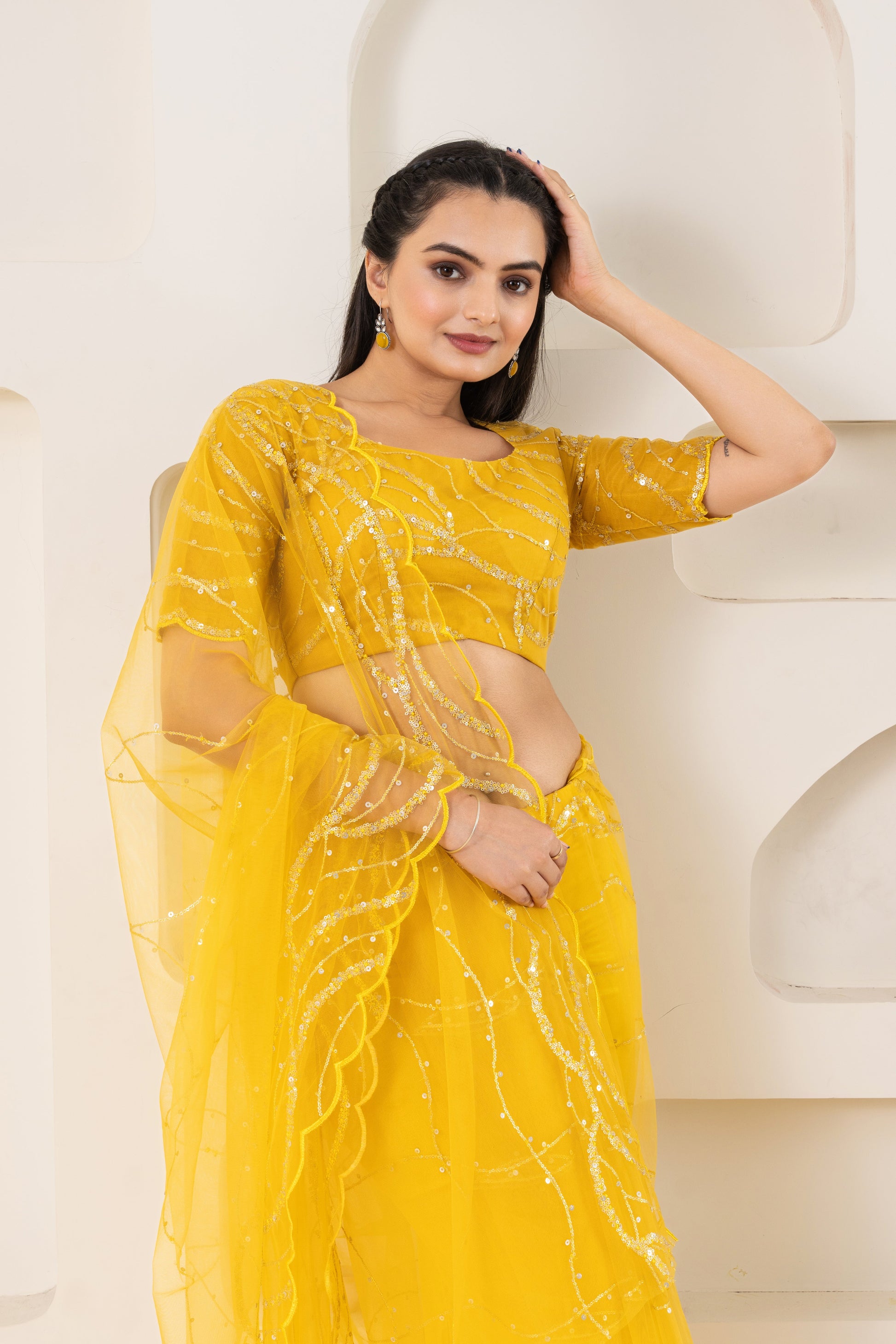 Dyed Fabric 1/ Saree : Gold And Silver Sequins With Thread Work Embroidery On Yellow Soft Net Fabric